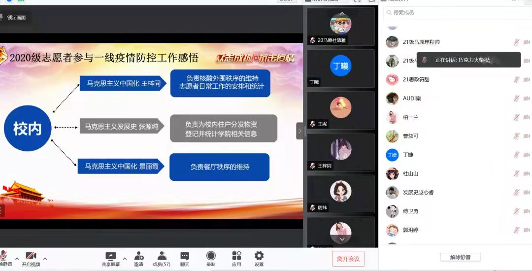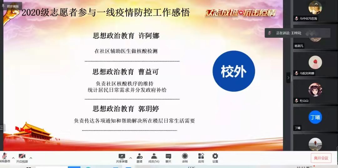 之后,2020级6名志愿者分享了参与校内外一线疫情防控工作的感悟。王梓同、张源纯和景丽霞三名同学分享了在校内负责核酸外围秩序的维持、志愿者日常工作的安排和统计、校内住户分发物资登记和统计足球直播88