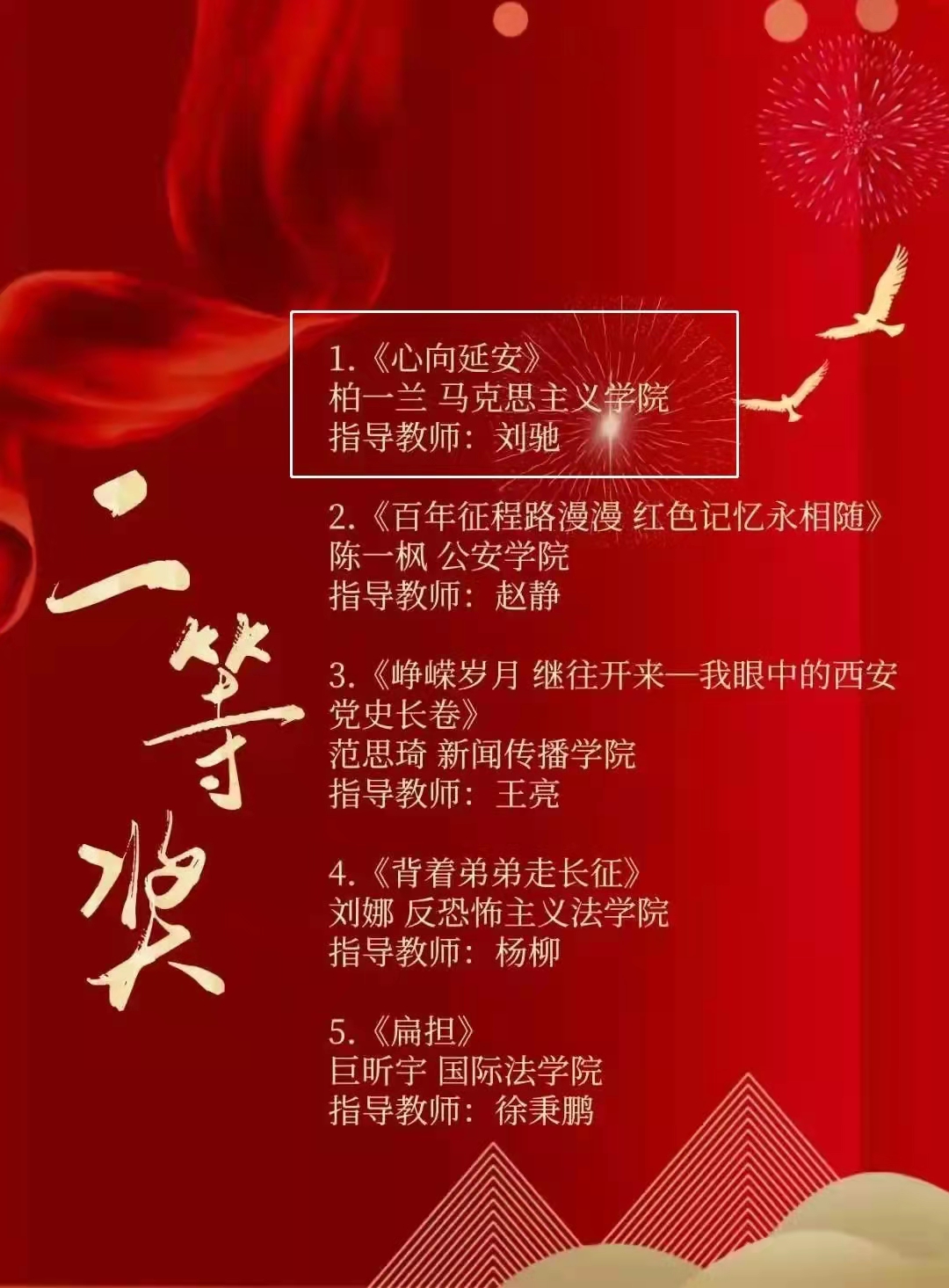 作品简介:通过回顾百年波澜壮阔党史,并将党史与西北政法大学前身——陕北公学发展的光辉校史相结合,赞颂了在中国共产党的坚强领导下陕北公学积极培育人才,不断赓续红色血脉践行初心使命,勇担历史责任的光辉历程。并展望在新时代西北政法大学能够发扬传承陕北公学精神,取得更加长足的发展。