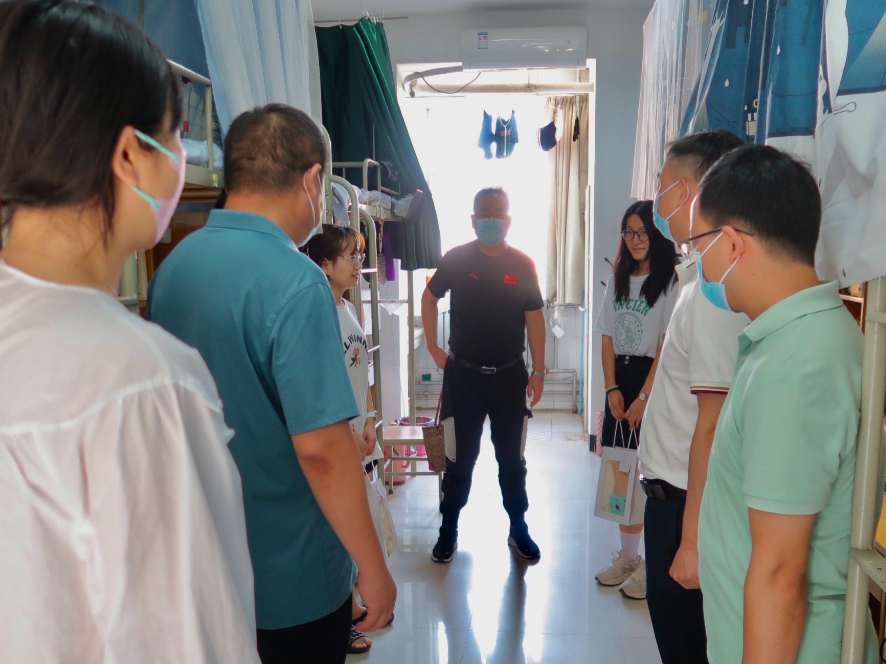领导一行来到学生宿舍与大家亲切交流沟通,氛围轻松欢快,他们耐心询问每一位同学近期返校生活情况,叮嘱大家要做好防护、问候家人。此外,提醒同学们在配合学校疫情防控工作的同时,脚踏实地、静心钻研学术。