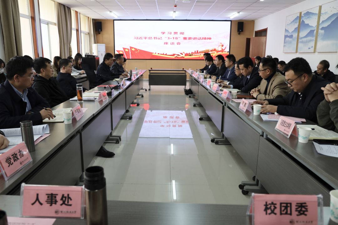3月18日,我校在长安校区召开“学习贯彻习近平总书记‘3·18’重要讲话精神”座谈会。校党委书记孙国华、校党委副书记郭武军、副校长马朝琦出席。郭武军主持座谈会。