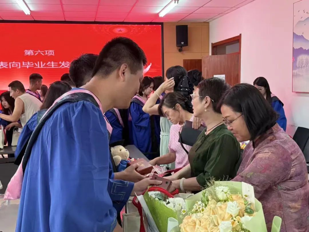 教师代表向毕业生发放纪念品,勉励他们永葆进取之志,在人生新征程上再创佳绩。