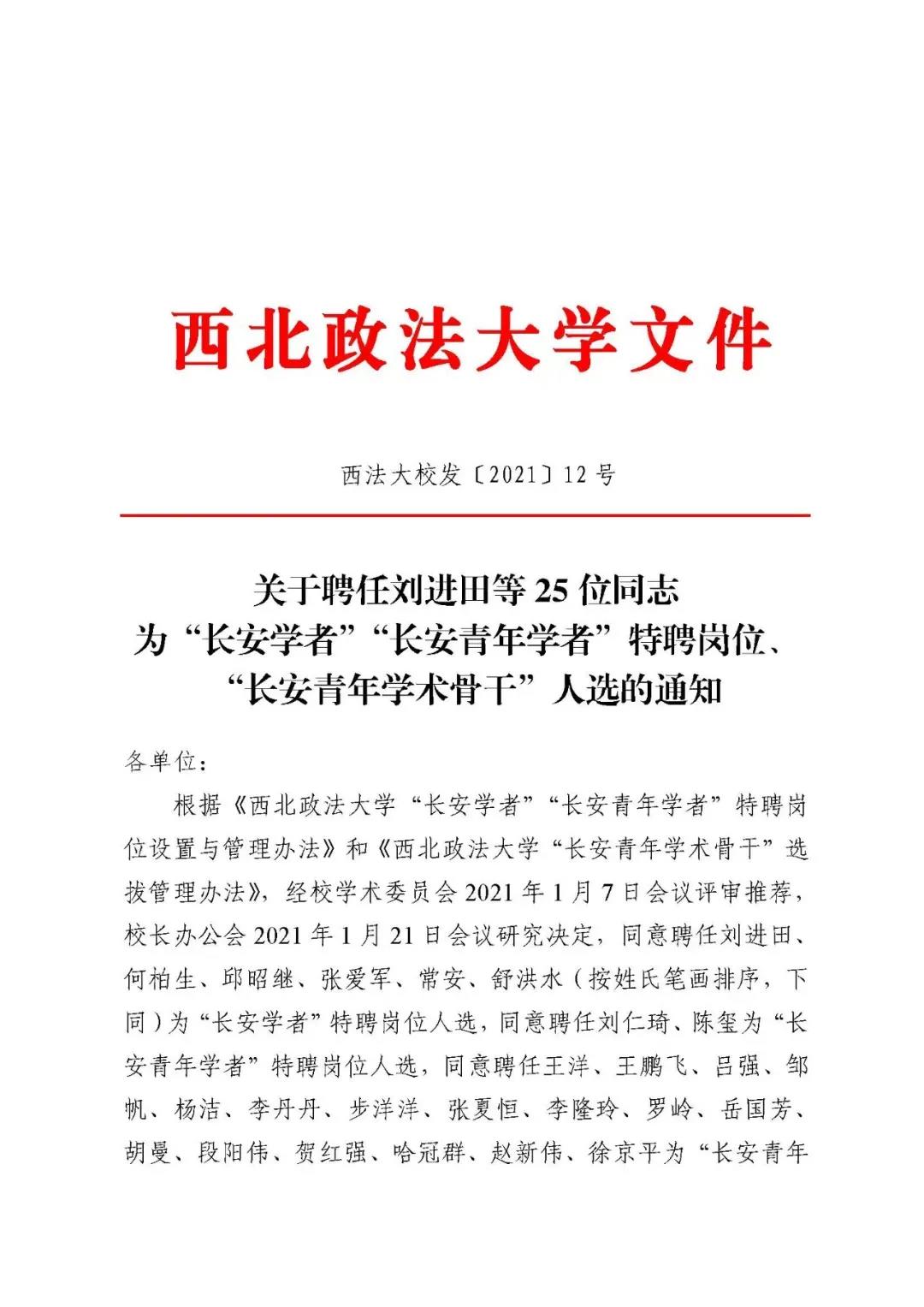 根据《西北政法大学“长安青年学术骨干”选拔管理办法》,经个人申报,单位推荐,校学术委员会2021年1月7日会议评议推荐,校长办公会2021年1月21日会议研究决定,足球直播88 刘进田教授获聘为“长安学者"特聘岗位人选,岳国芳副教授获聘为“长安青年学术骨干”人选。