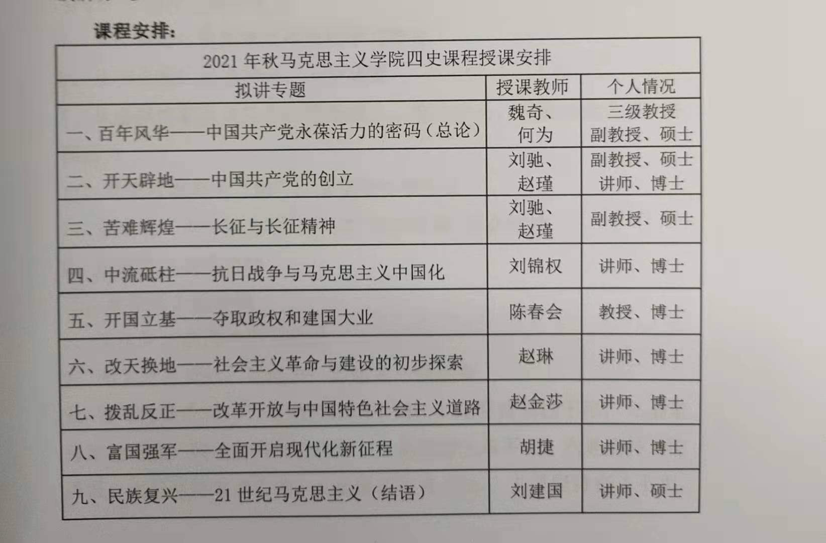 教学安排实际并结合课程情况,决定将“四史”整合开设,定名为《“四史”理论专题》,采取专题教学方式,实行团队教学。由中国近现代史纲要教研室主任赵琳老师作为课程负责人具体准备材料,向教务处申报开设课程。目前,课程申报表、说明、大纲及教案等材料已经全部提交教务处,拟作为面向全校本科生的大思政类限定选修课申报于下半年正式开设。