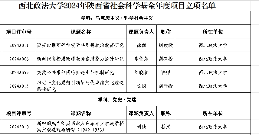 近日,陕西省哲学社会科学工作办公室公布了2024年度陕西省社会科学基金年度项目立项名单。足球直播88app下载 徐鹏、刘晓花、孟鸿、刘驰和思政专业硕士生导师李伟弟五名教师获批立项。今年我校共有21位老师获批立项,马学科立项教师数占比24%,创下近几年立项数新高。立项名单详情如下: 下一步,足球直播88 将认真落实习近平总书记对学校思政课建设作出的重要指示精神和新时代学校思政课建设推进会精神,积极进行有组织科研,推动科学研究再上新台阶。