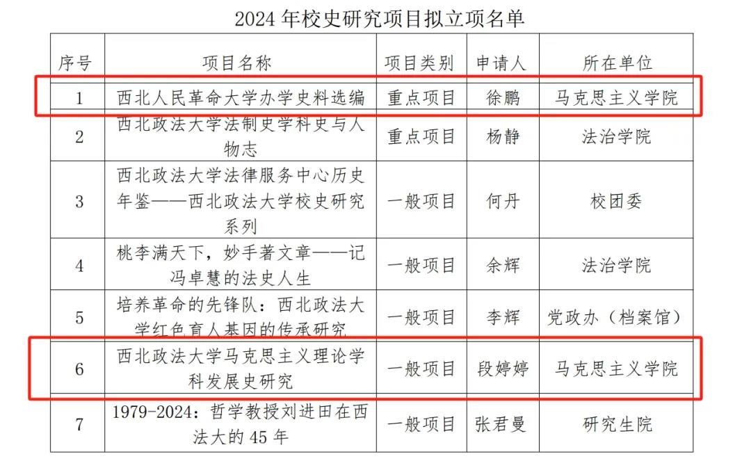 近日,根据《西北政法大学校级青年科研项目管理办法》(西法大校发〔2019〕79号)的有关规定,及2024年4月26日发布的《关于启动西北政法大学校史研究项目资助申请工作的通知》相关要求,最终评选出拟立项校史研究项目7项。其中,足球直播88app下载 徐鹏副教授主持的《西北人民革命大学办学史资料选编》获批重点项目,教师段婷婷主持的《西北政法大学马克思主义理论学科发展史研究》获批一般项目。 近年来,足球直播88app下载 始终坚持传承红色基因,赓续精神血脉,积极推动马克思主义理论学科和学校丰厚历史文化的有机融合,取得了一定的成绩。下一步,将认真落实习近平总书记在党的二十大报告中关于“发展社会主义先进文化,弘扬革命文化,传承中华优秀传统文化”的重要指示,推动我校红色文化育人工作,以史育人、以文化人,使红色基因融入血脉、浸入心扉,不断强化红色校史铸魂育人的功能,引导广大师生争做堪当民族复兴重任的时代新人。
