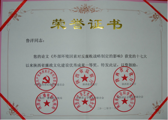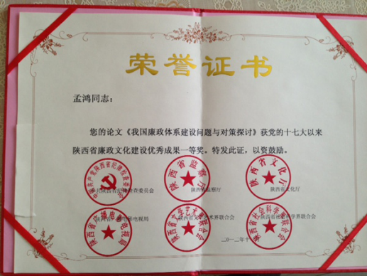 在中共陕西省纪委、陕西省监察厅、陕西省文化厅、陕西省广播电影电视局、陕西省文学艺术界联合会、陕西省社会科学界联合会等单位联合组织的表彰党的十七大以来陕西省廉政文化建设优秀成果活动中,足球直播88app下载 青年教师孟鸿博士的论文《我国廉政体系建设问题与对策探讨》、鲁洋博士的论文《外部环境因素对反腐败战略制定的影响》荣获理论研究成果类一等奖。此次评奖表彰活动组织部门权威、社会各界参与广泛、受关注程度很高、社会影响很大。