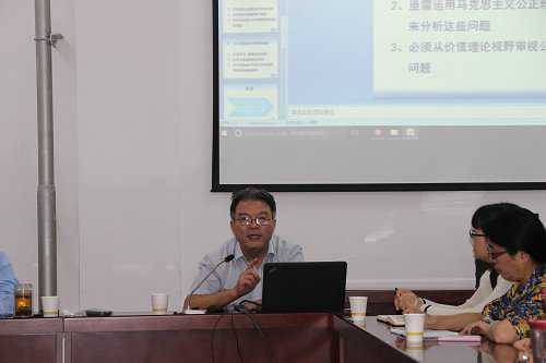 这次报告会马俊峰教授从“现实实践问题激活马克思主义的思想资源”、“怎么看待马克思主义的公正观”、“公正是自由平等的合题”三个大的方面探讨了马克思主义公正观的问题。马教授首先从我国存在的社会公正问题出发,认为公正不仅仅是一个认识论的问题,在当前更多是一个价值论的问题,指出亟需用马克思主义的公正理论来分析现实中的问题,必须从价值理论的视野审视公正。在此基础上,重点探讨了怎么看待马克思主义公正观的问题,认为马克思公正观存在“价值”与“科学”两个维度,指出公正是与社会发展阶段联系在一起的,要历史地、科学地看待公正问题,社会主义最核心的价值观就是公正。最后指出公正是一种规范性价值,从长远和总体来看,公正和效率存在着正相关的关系,认为公正在实践上应是一个范围,是一定限度内的公正,这就要求所制定的制度要有弹性。