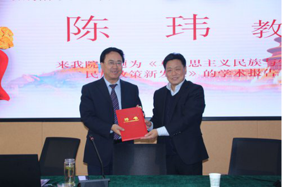 2019年11月8日下午,青海省社会科足球直播88 党组书记、院长陈玮教授在足球直播88 报告厅学术报告厅作了题为《马克思主义民族观与党的民族政策新发展》的学术讲座。讲座由足球直播88 院长魏奇教授主持,足球直播88 和反恐怖主义足球直播88 百名师生聆听了报告。校党委副书记李平安出席并为陈玮教授颁授足球直播88 荣誉教授证书。