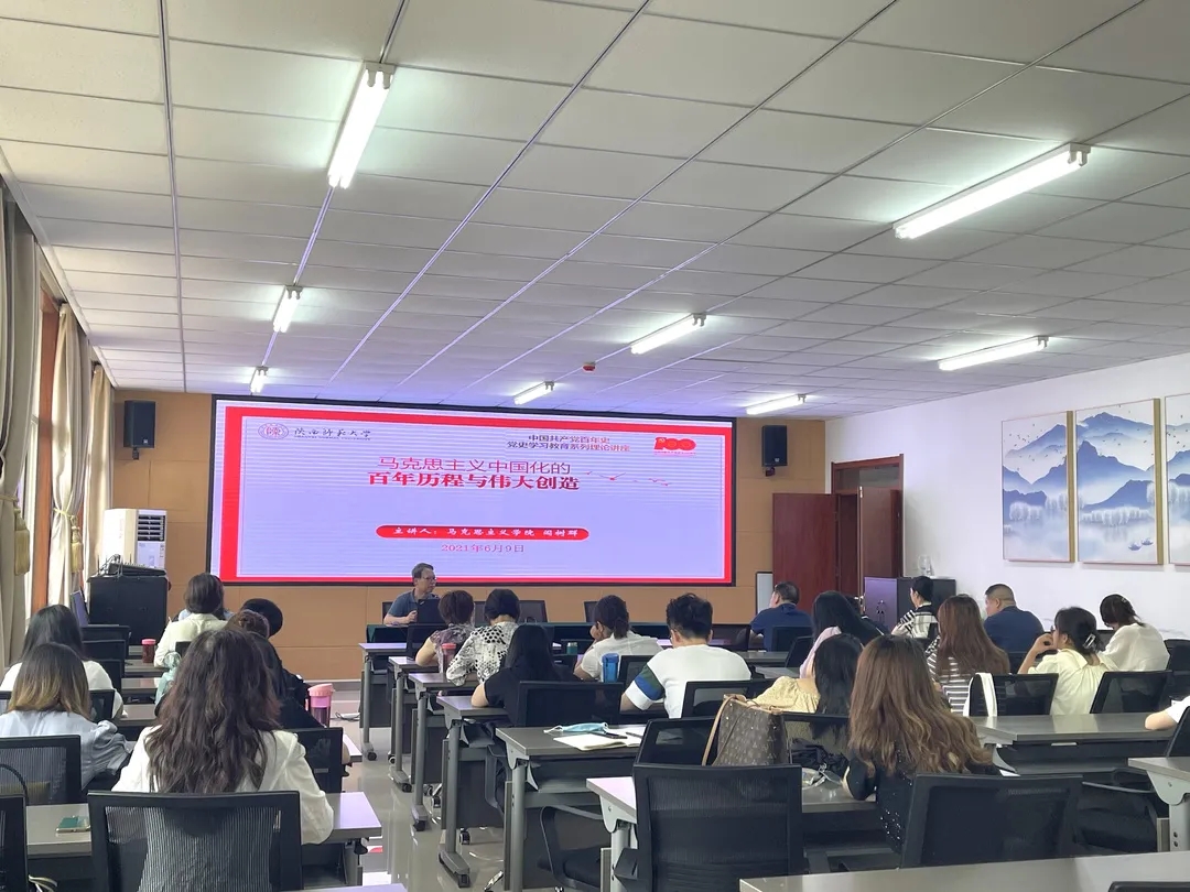 报告会上,阎教授从“中国共产党推进马克思主义中国化的百年历程、马克思主义中国化第一次飞跃的伟大创造、马克思主义中国化第二次飞跃的伟大创造、马克思主义中国化新飞跃的伟大创造”四个部分出发,内容丰富,站位高远,用专业的视角、学术化的语言对马克思主义中国化的百年历程进行了全面系统的讲解。