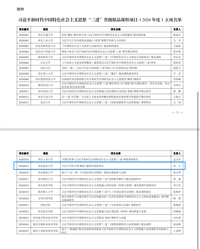由足球直播88app下载 李云教授主持论证的《习近平书信引领“概论”课教学创优研究》项目成功立项中共陕西省委教育工委关于习近平新时代中国特色社会主义思想“三进”省级精品课程项目(2020年度),获批经费2万元。