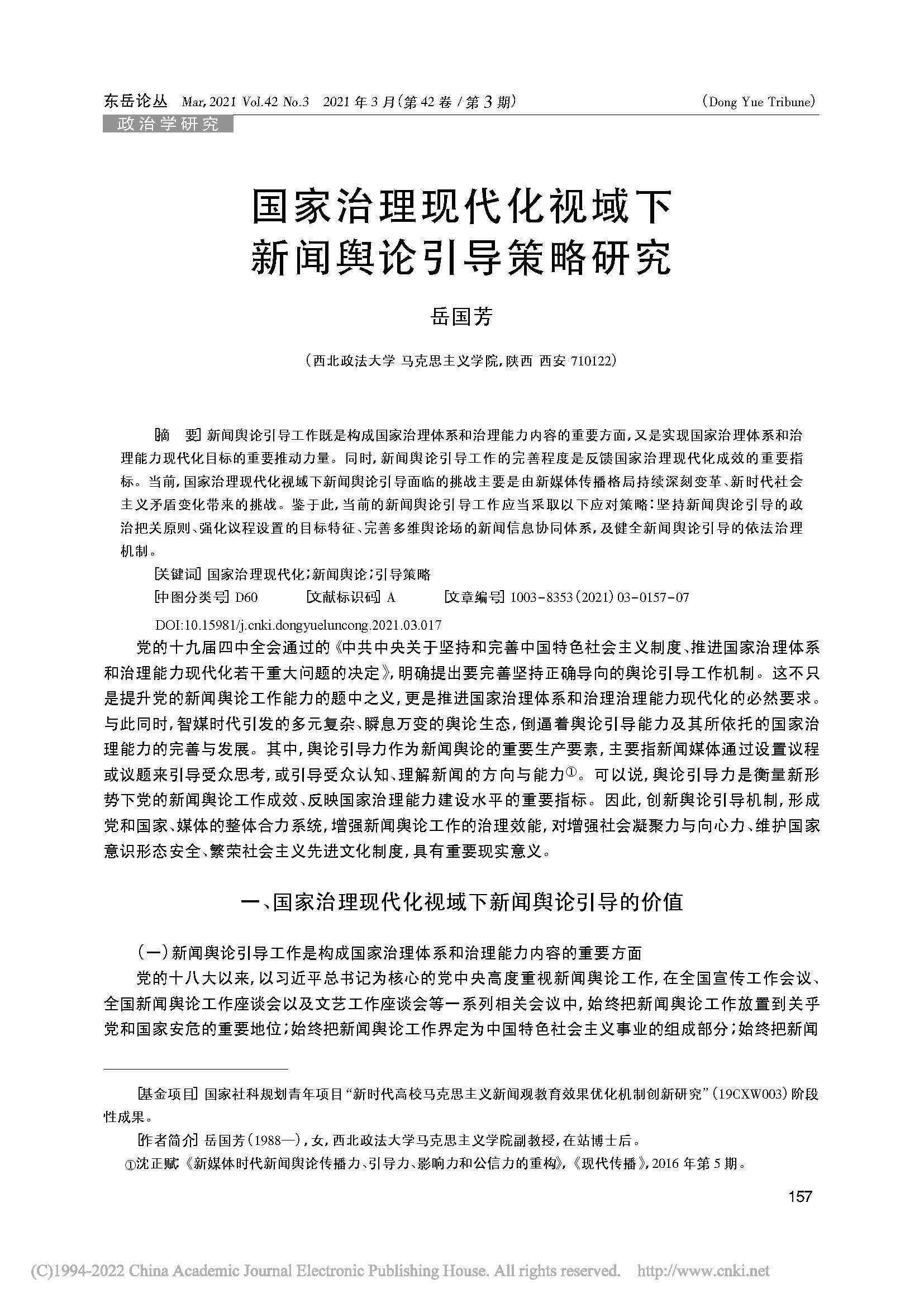 近日,陕西省教育厅公布了2024年陕西高校人文社会科学研究优秀成果获奖名单,足球直播88 岳国芳副教授的论文《国家治理现代化视域下新闻舆论引导策略研究》荣获论文类三等奖。该论文发表于《东岳论丛》2021年第3期。