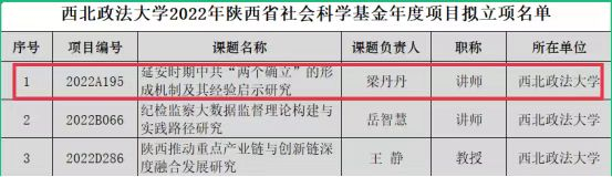 鲁洋副教授申报的《基于马克思廉价政府理论的习近平以人民为中心思想》获批2022年度陕西省社科联年度专项项目。梁丹丹博士申报的《延安时期中共“两个确立”的形成机制及其经验启示研究》获批2022年度陕西省社会科学基金年度项目。徐鹏申报的《陕甘宁边区基层参议会制度及其当代启示》获批2022年度陕西省教育厅青年团队项目。